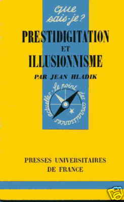 Titre : Prestidigitation et illusionnisme Type de document : texte imprimé Auteurs : Jean HLADIK, Auteur Mention d'édition : 2ème édition Editeur : PUF Année de publication : 1974 Importance : 127 pages Format : 17,5 x 11,5 ISBN/ISSN/EAN : B0014VEPF0 Note générale : Livre thèse généraliste : § 1 Historique. §2 Les manipulations. §3 les trucages. §4 la présentation. §5 les tours. Langues : Français (fre) Réservation